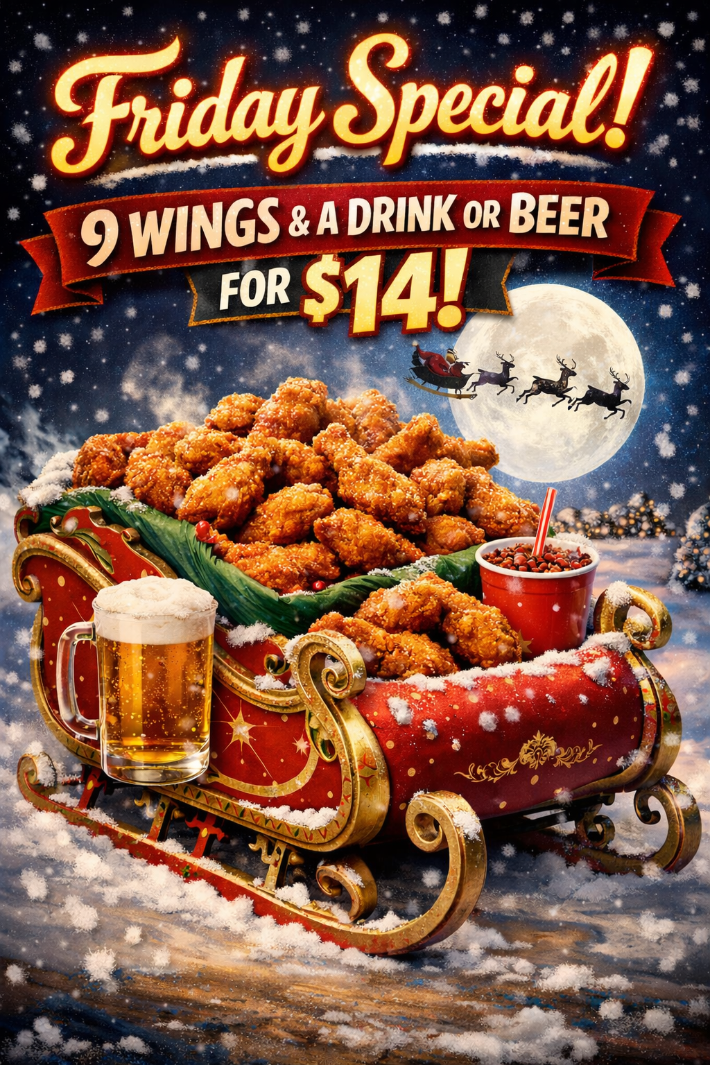 Come on between noon and 3 pm for 9 Wings and a drink for $13.
