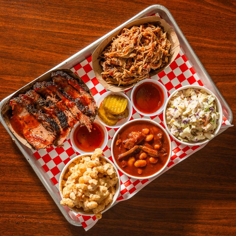 6 ounces smoked brisket, 6 ounces pulled pork. Comes with 8 ounces each of BBQ brisket, cowboy beans, honey apple crisp coleslaw, and smoked mac-n-cheese.