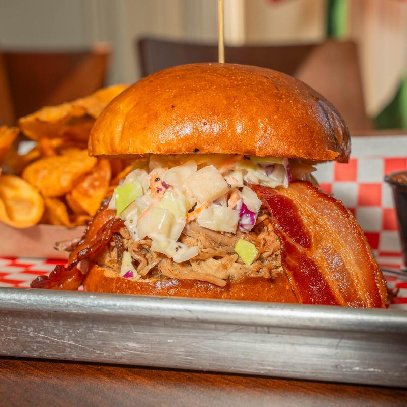Hardwood-smoked pulled pork, crispy bacon, honey crisp apple coleslaw, and House BBQ sauce on a steamed roll. Comes with one BBQ side and house chips.